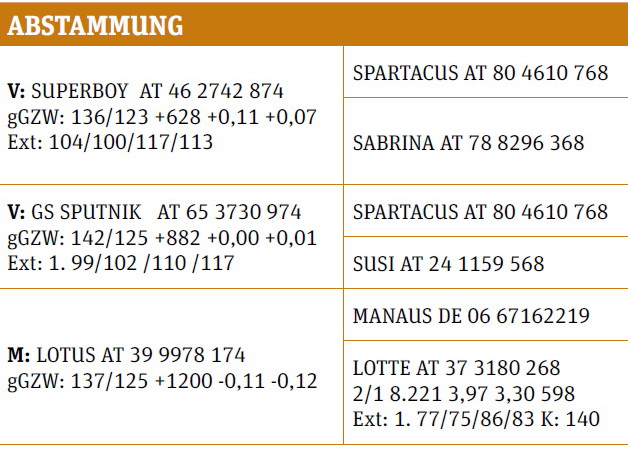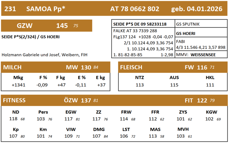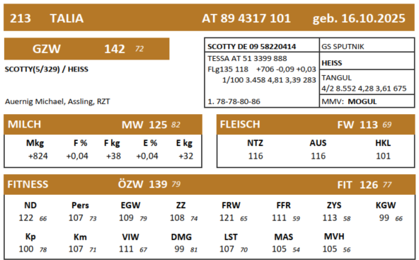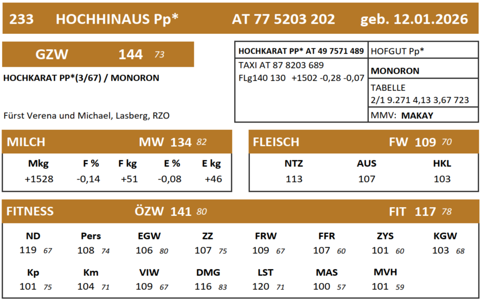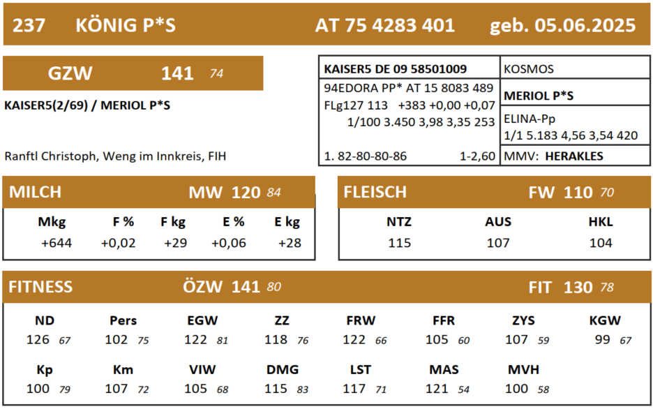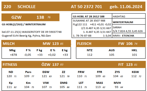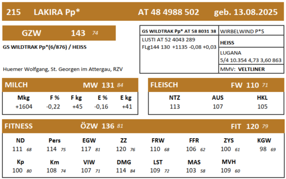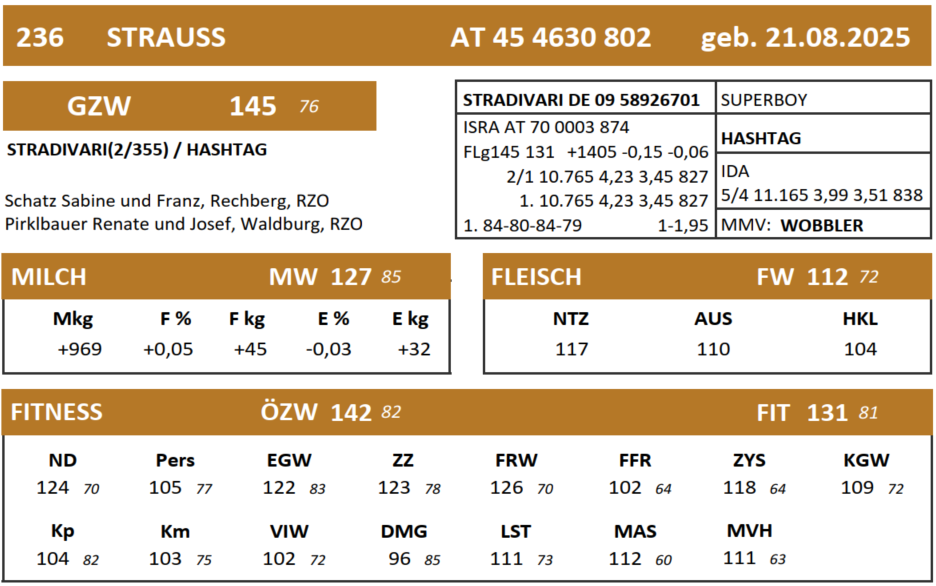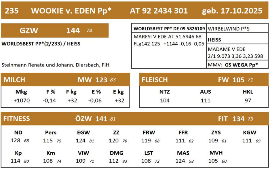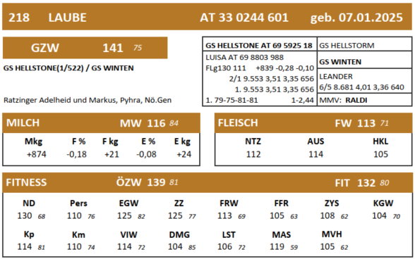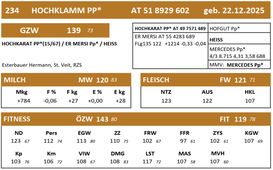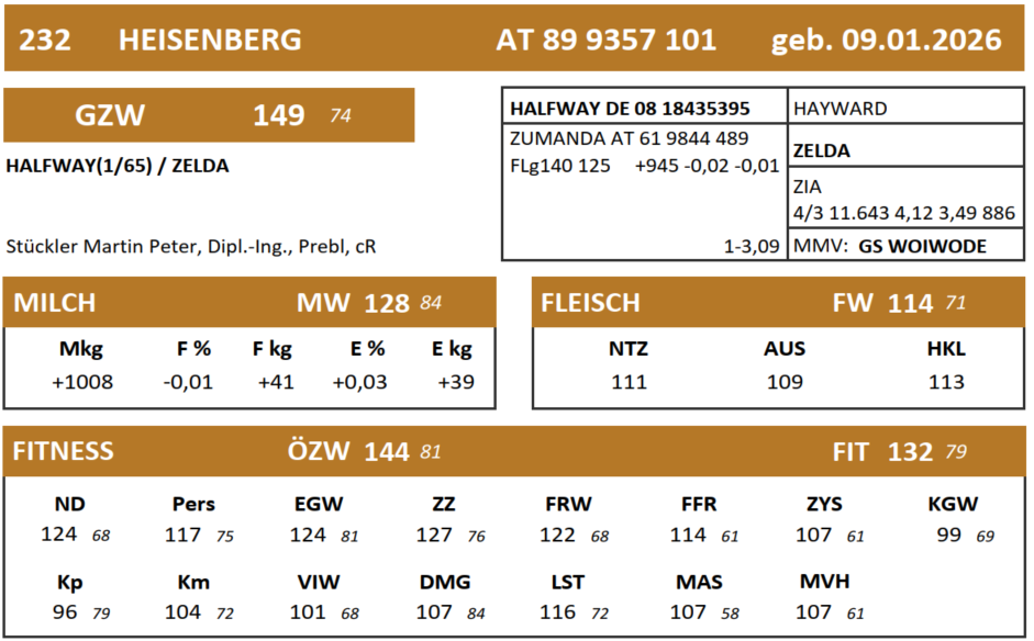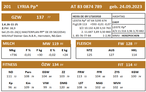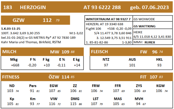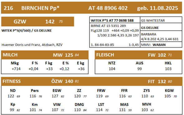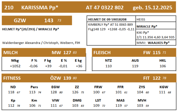 Auch im männlichen Segment war die Qualität beeindruckend: Sieben Kandidaten wurden für die Eliteversteigerung gemeldet und erreichten im Durchschnitt einen Gesamtzuchtwert von 144 Punkten. Angeführt wurde diese Gruppe von einem hochtypisierten Kandidaten mit GZW 149. Abgerundet wurde das Angebot durch sieben Embryonenpakete aus topaktuellen Spitzenpaarungen.