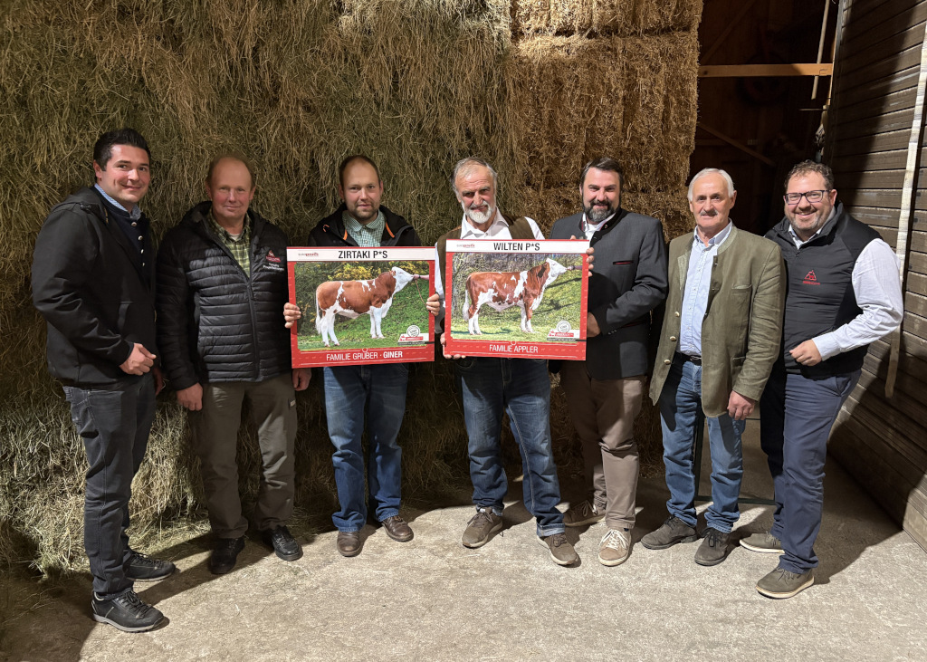 Im Rahmen der Veranstaltung „Fleckvieh vor Ort“ wurden zwei herausragende Stierzüchter aus Tirol für ihre außergewöhnliche Zuchtarbeit ausgezeichnet: Familie Appler aus Innsbruck für den WIRBELWIND P*S-Sohn WILTEN P*S und Familie Gruber aus Hopfgarten für den ZELDA-Sohn ZIRTAKI P*S. Beide Stiere wurden bereits als genomischer Jungvererber im Verbandsgebiet beziehungsweise im EUROgenetik-Gebiet erfolgreich eingesetzt.