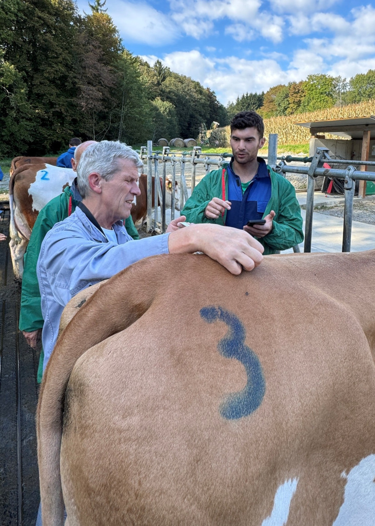 Der erste Seminartag stand ganz im Zeichen der praktischen Anwendung von FleckScore zur linearen Beschreibung von Fleckviehkühen. Für diese Einheit bot der Zuchtbetrieb von Barbara und Benedikt Hiebaum in St. Margarethen an der Raab ideale Bedingungen. Im Auslauf des Betriebs standen sechs Fleckvieh-Jungkühe zur Bewertung bereit.