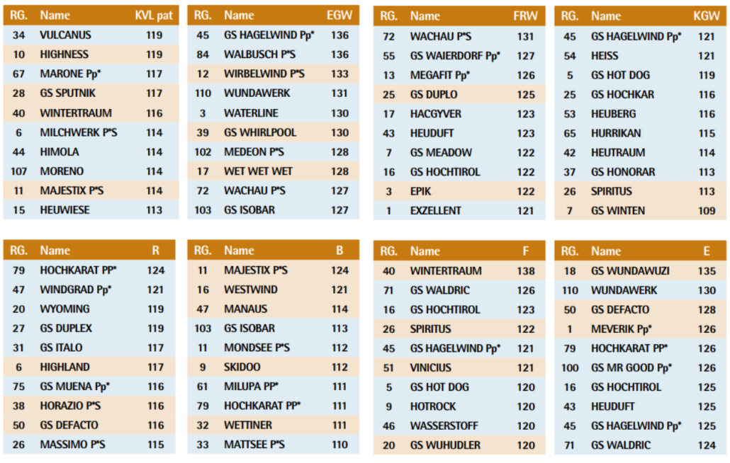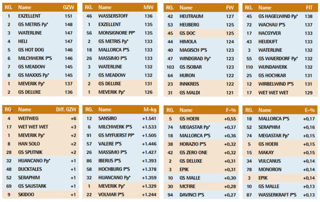 Hier finden Sie nach jeder Zuchtwertschätzung rasch und übersichtlich die in den Einzelmerkmalen besten Vererber. Die Auflistung enthält die in den Einzelmerkmalen besten 10 Stiere einer gemeinsamen Liste aus NK-geprüften Stieren (braun hinterlegt) und genomischen Jungstieren (blau hinterlegt). Gereiht sind die Listen nach den Zuchtwerten des jeweiligen Einzelmerkmals/dem Gesamtzuchtwert/dem Milchwert. Die beiden besten NK-geprüften Stiere werden in jedem Fall gelistet, auch wenn sie nicht unter den ersten zehn sind.