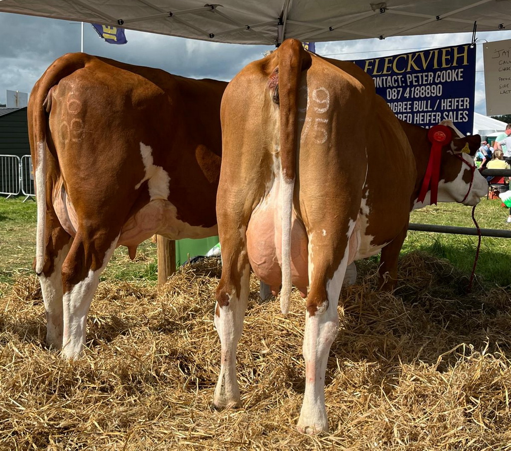 Zwei elegante Fleckviehkühe auf der Tullamore Show 2025: GS VERISMO PP-Tochter (li.) und WRANGLER Pp-Tochter (re.), Besitzer: Peter Cooke