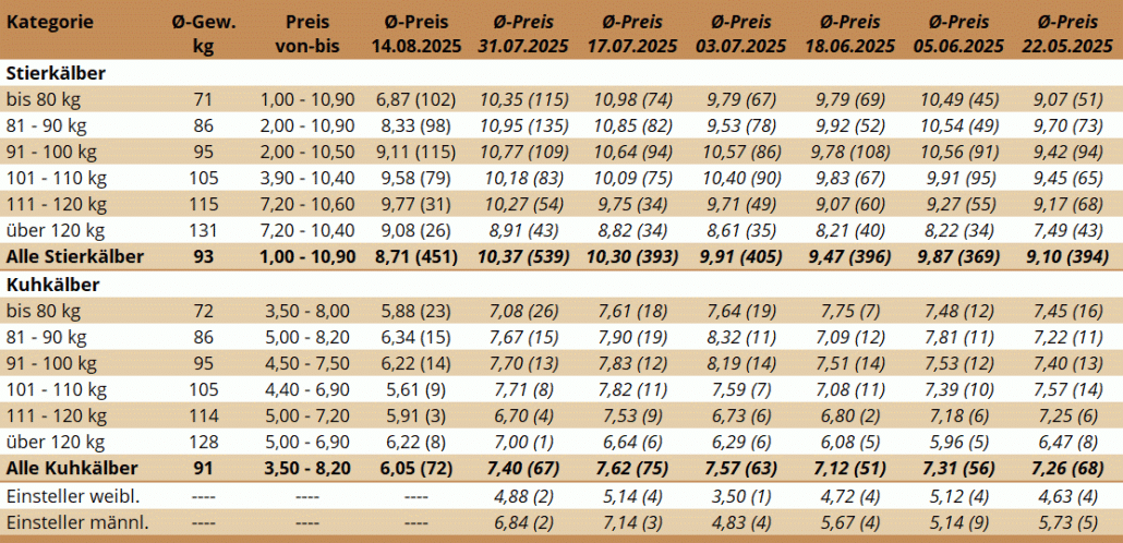 Preisstatistik Kälbermarkt Bergland 14.8.25
