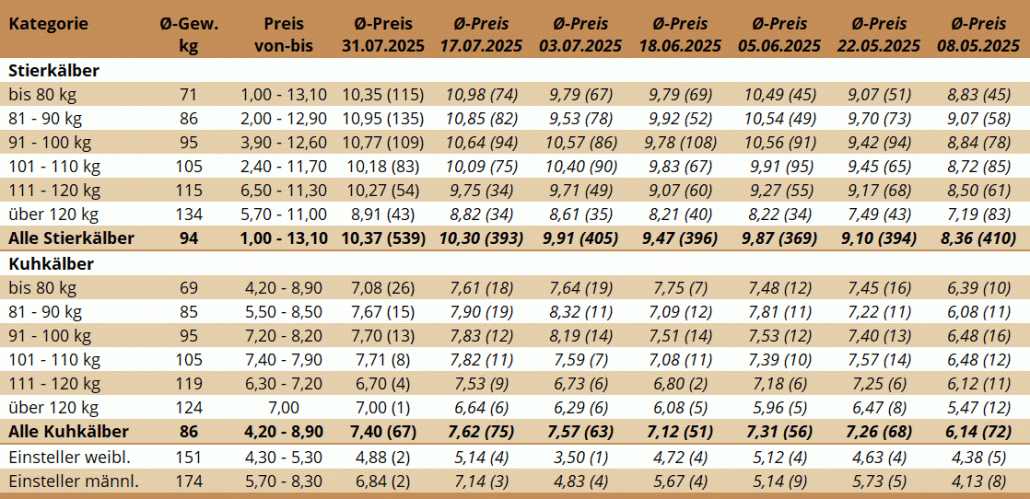 Preisstatistik Kälbermarkt Bergland 31.7.25