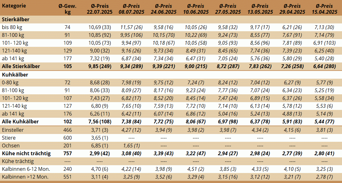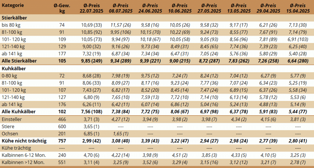 Beim Kälber- und Nutzrindermarkt am 22.07.2025 in der steirischen Greinbachhalle wurde ein gutes Angebot von 414 Stück vermarktet. Es waren bei diesem Markt relativ wenige private Käufer anwesend. Die breite Händlerschaft sorgte aber für eine marktkonforme Preisbildung in allen Kategorien.