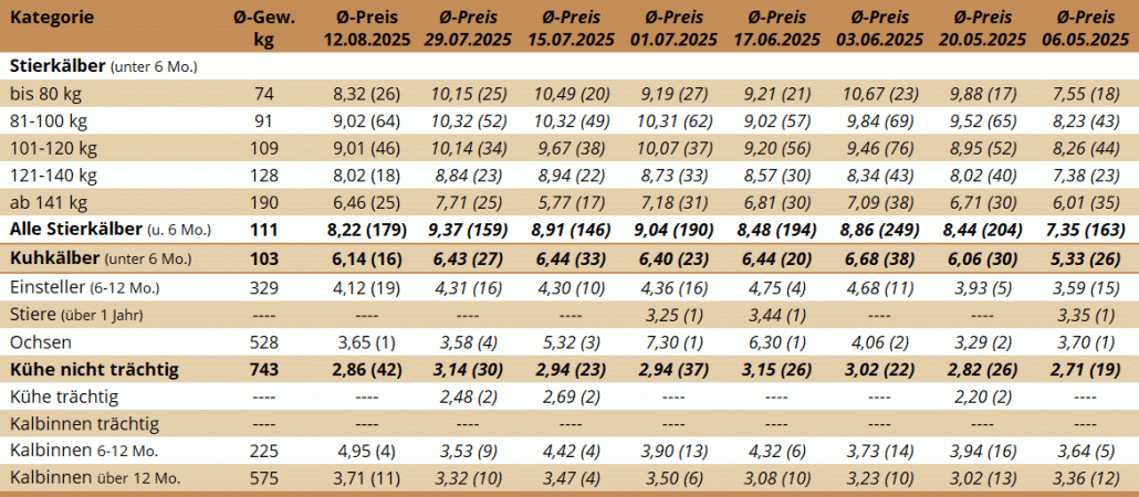Aktuell befinden sich die Stierkälberpreise in Österreich auf einen Sinkflug. Wo der „neue Boden“ gefunden wird, ist aktuell schwierig abzuschätzen. Seitens der Käufer ist eine gewisse Verunsicherung zu spüren bzw. eine abwartende Haltung. Die gut entwickelten Stierkälber konnten zu einem sehr großen Teil zwischen 9 und 10 Euro netto vermarktet werden. Nicht altersgerecht entwickelte Kälber bzw. schwächere Kälber mussten die deutlichsten Preisreduktionen hinnehmen.