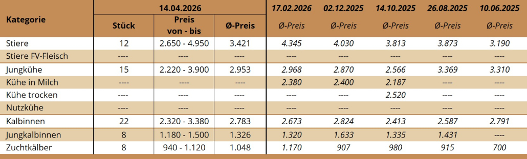 Die Zuchtrinderversteigerung am 14. April 2026 in St. Donat (Kärnten) war mit einem qualitativ guten, aber sehr kleinen Angebot beschickt. Trotz deutlichem Rückgang des Milchpreises im ersten Quartal 2026wurden die weiblichen Zuchtrinder vom heimischen und italienischen Handel gut nachgefragt.